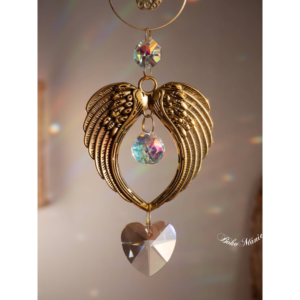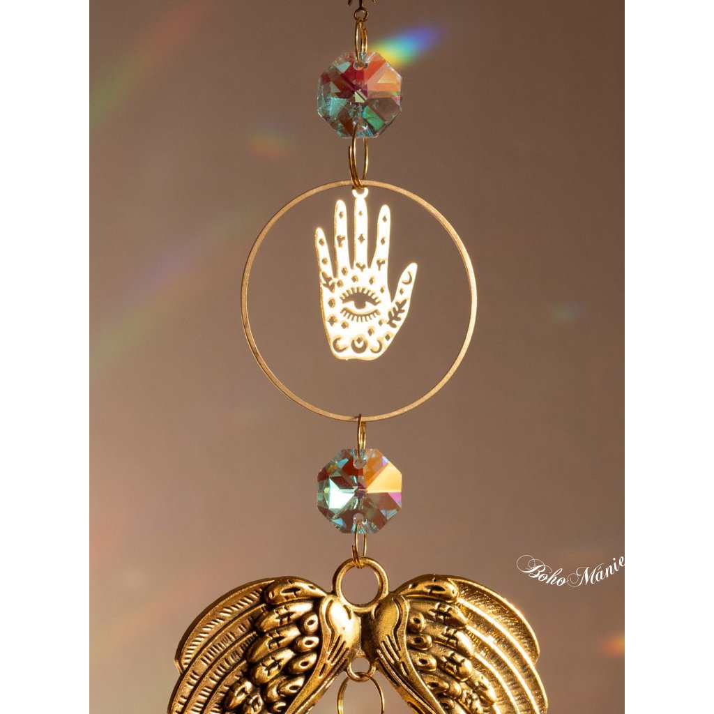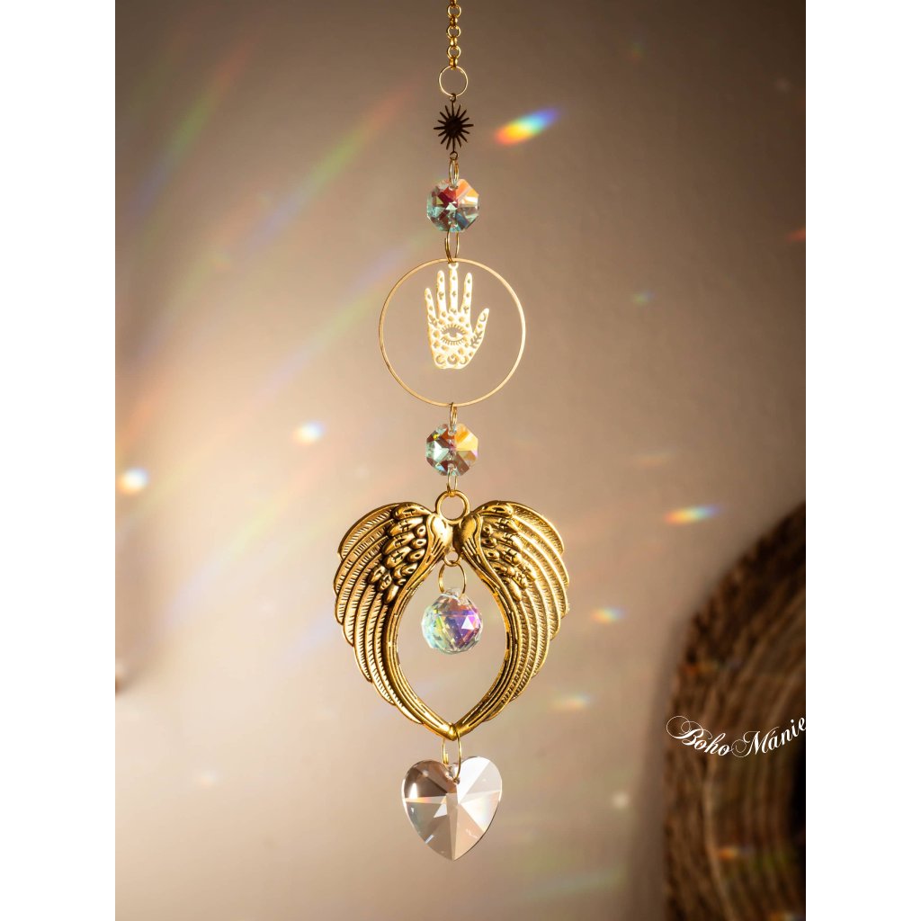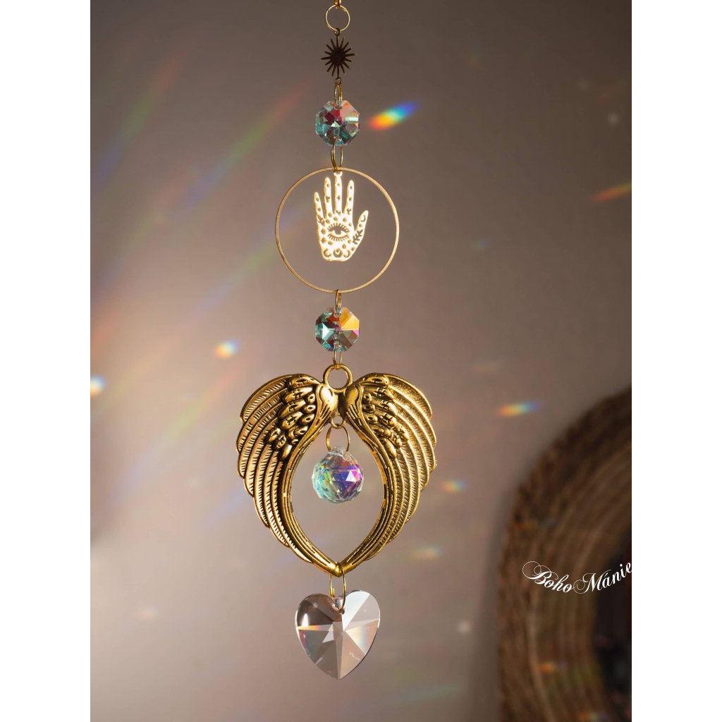 Zlatá hamsa přináší bdělou ochranu, andělská křídla dodávají lehkost a pocit bezpečí a broušené krystaly vše převádějí do jemných duhových záblesků, které prostor projasní bez ohledu na denní dobu.