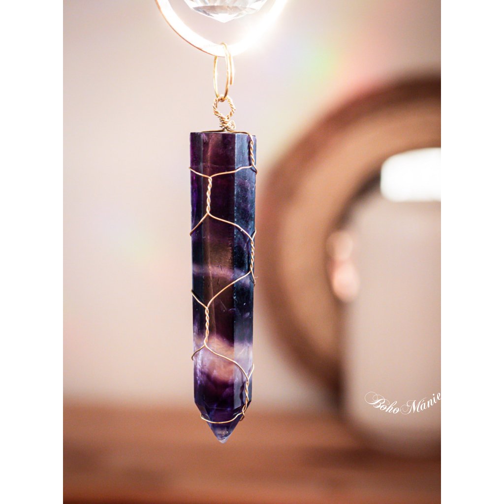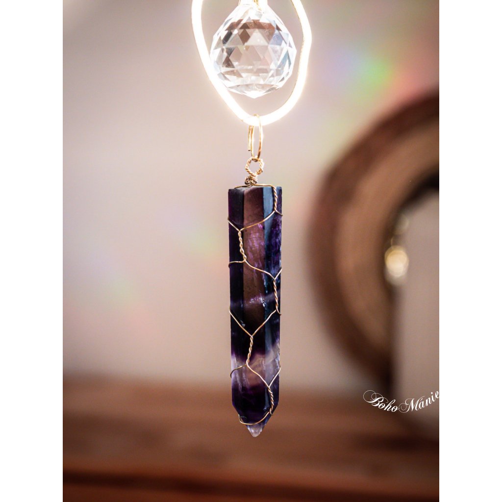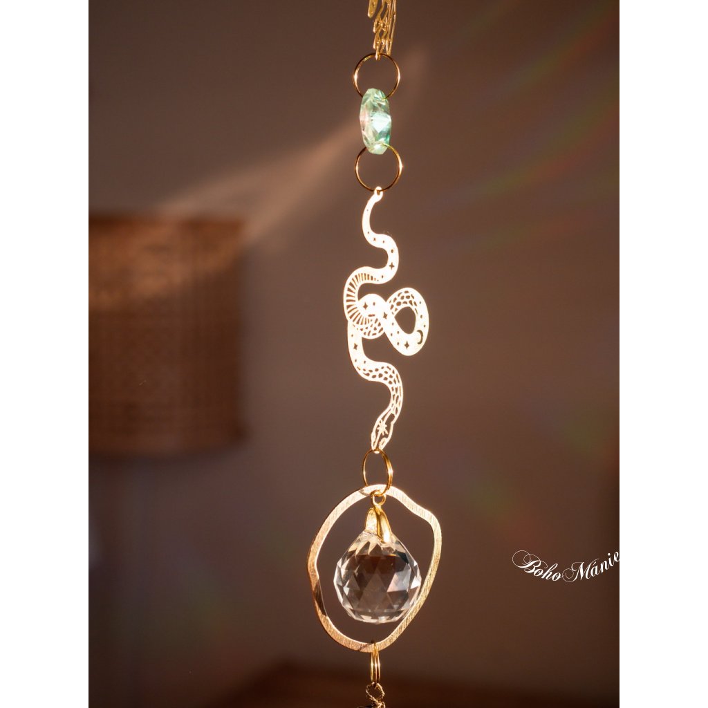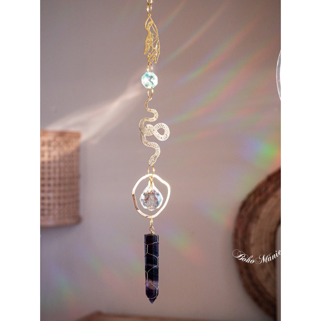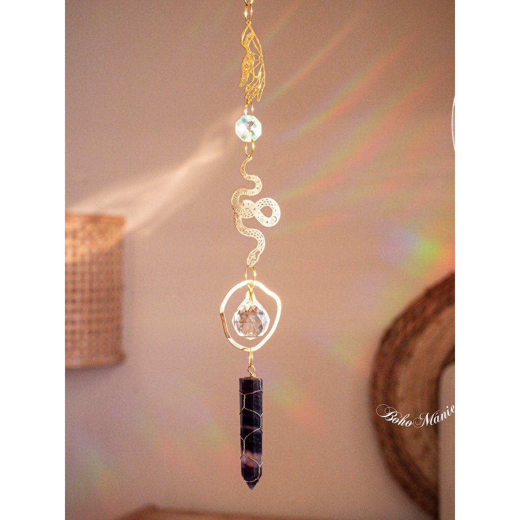 Tento lapač slunce s fluoritem propojuje světlo, hadí symbol proměny a uklidňující jas minerálu, který čistí mysl od šumu a přináší soustředění. Je to prostorový talisman, který rozzáří místnost a zároveň ji naladí do klidu, řádu a čisté intuice.