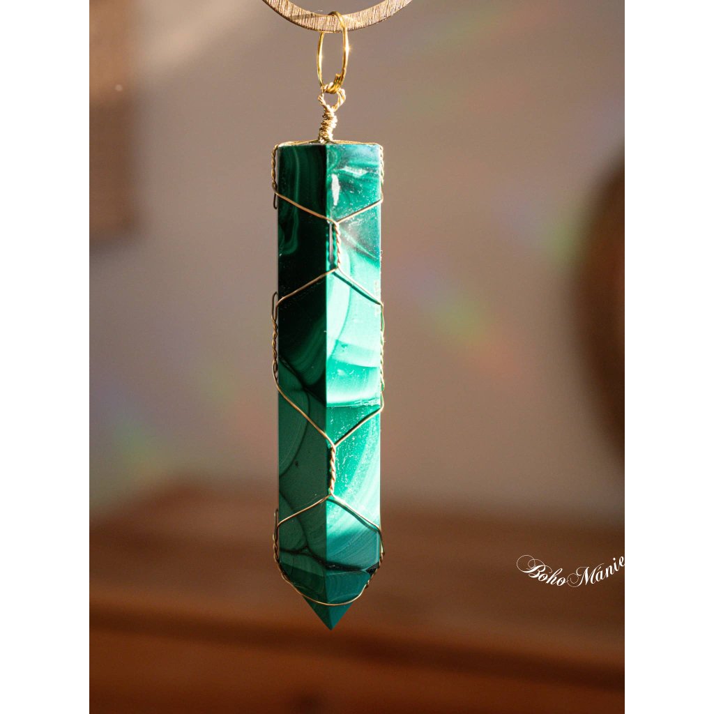 Malachitová špička změkčuje napětí v emocích, podporuje intuici, pravdivost a vnitřní uvolnění atmosféry.