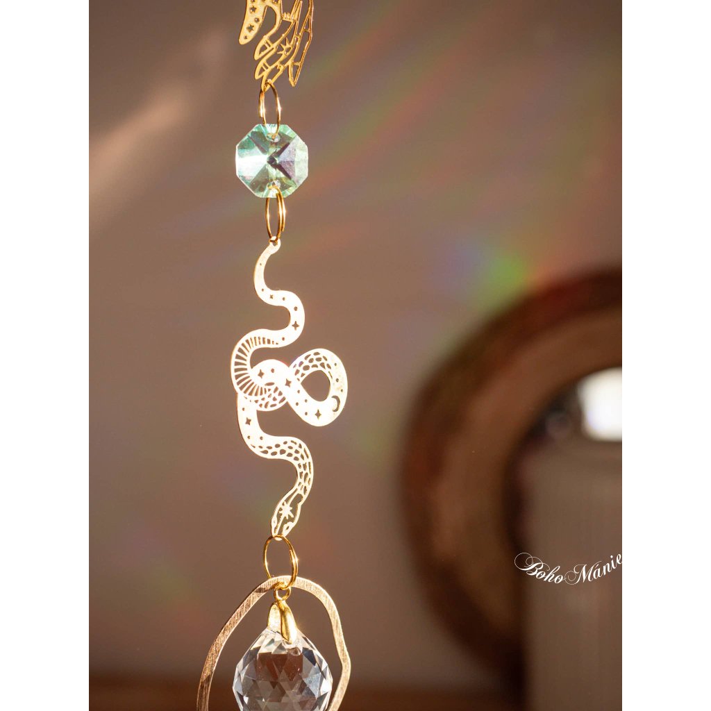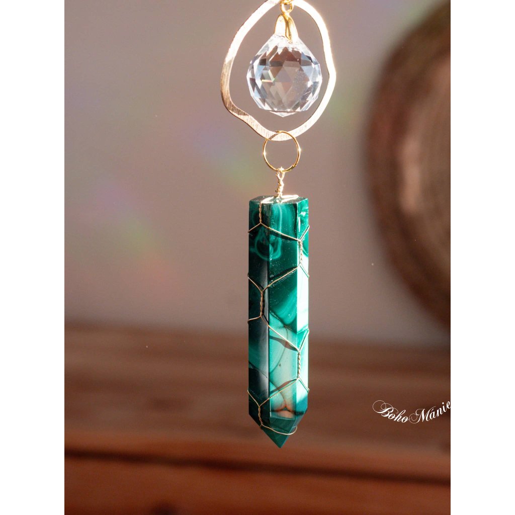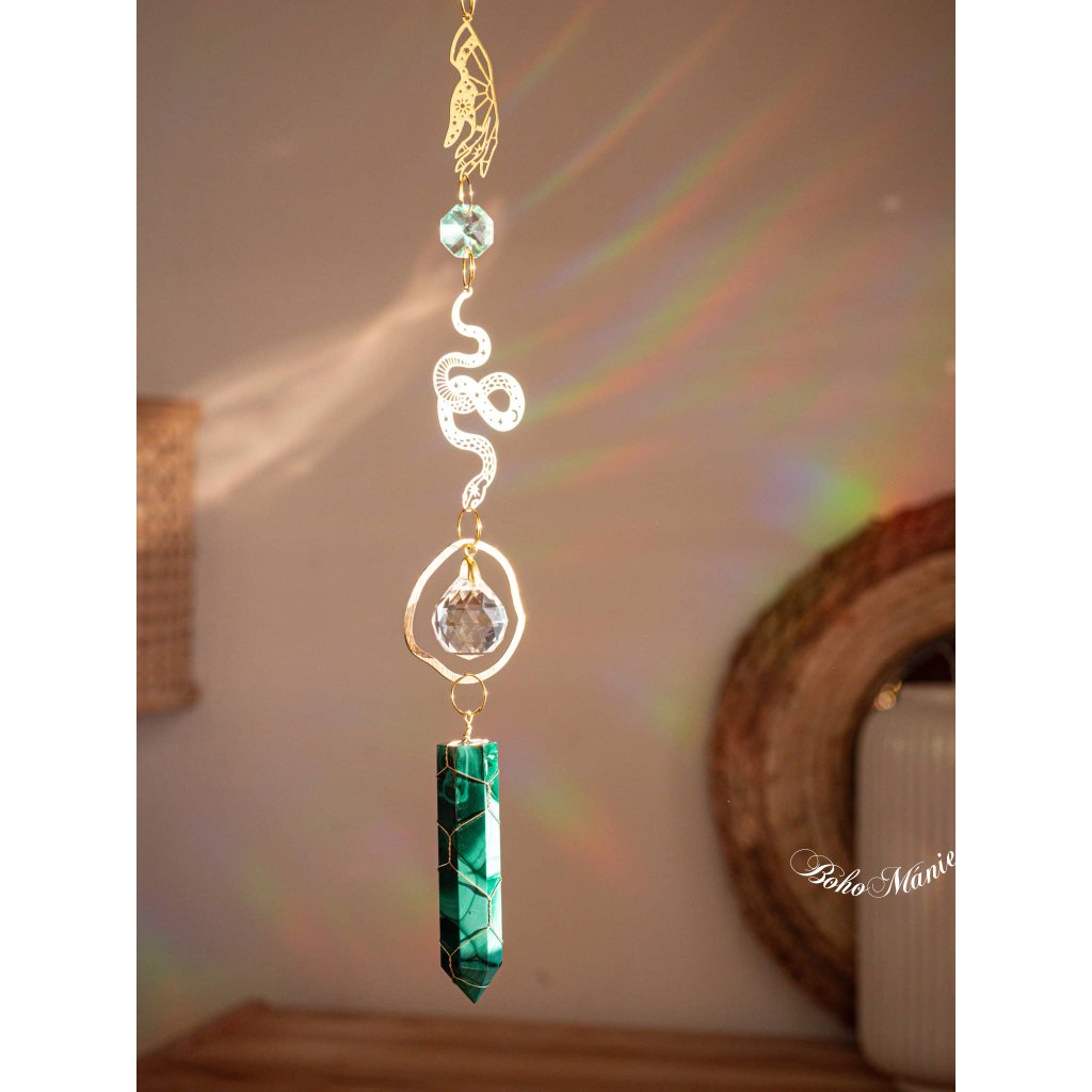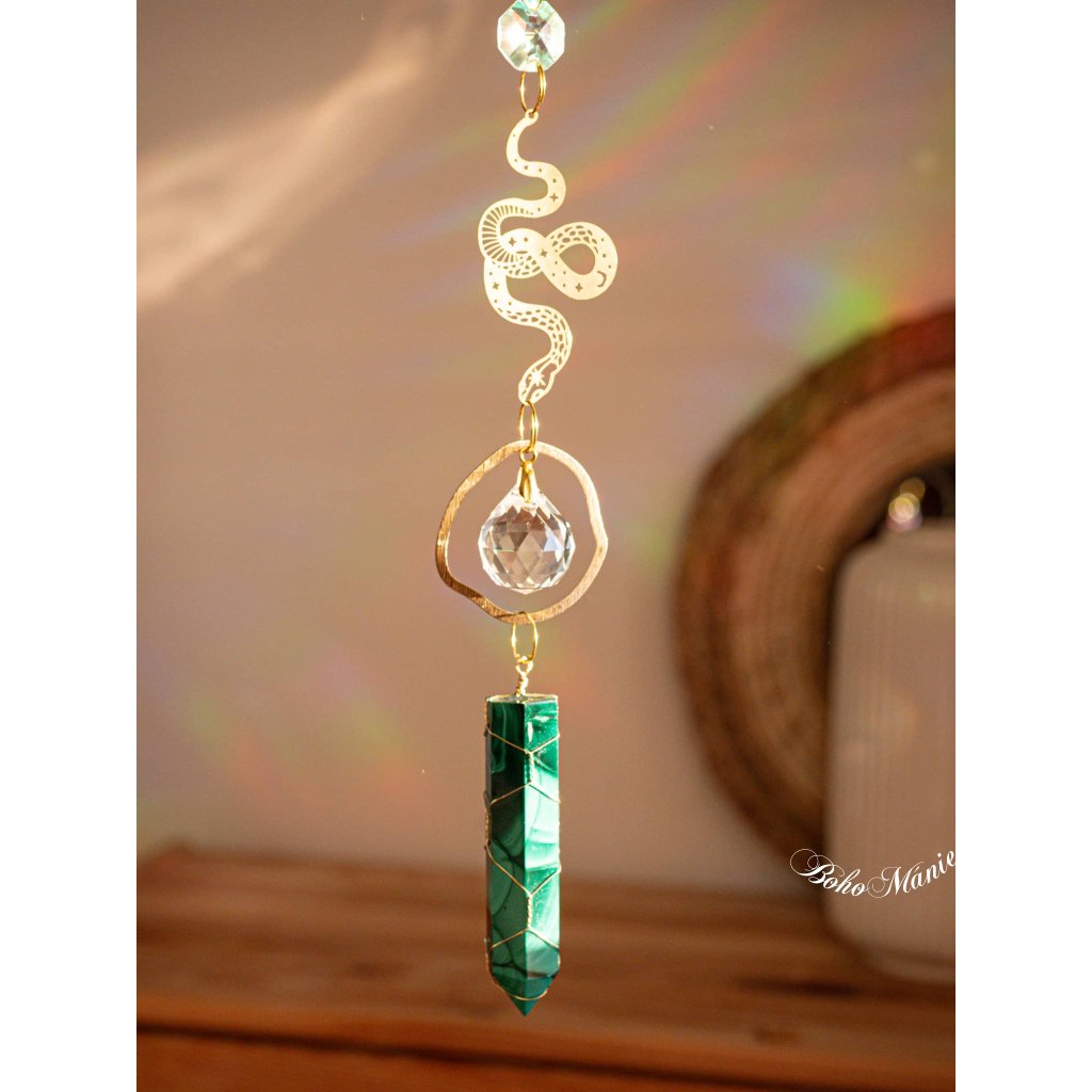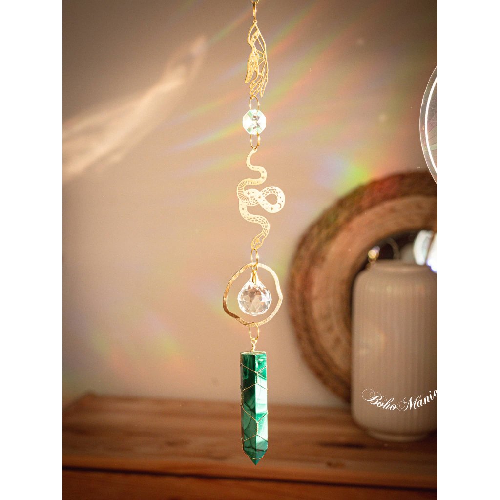 Tento lapač slunce s malachitem propojuje světlo s hadí energií transformace — podporuje intuici, chrání prostor a zve do něj klidnější, pravdivější atmosféru. Každý zachycený paprsek rozpohybuje jemný proud obnovy a očisty.