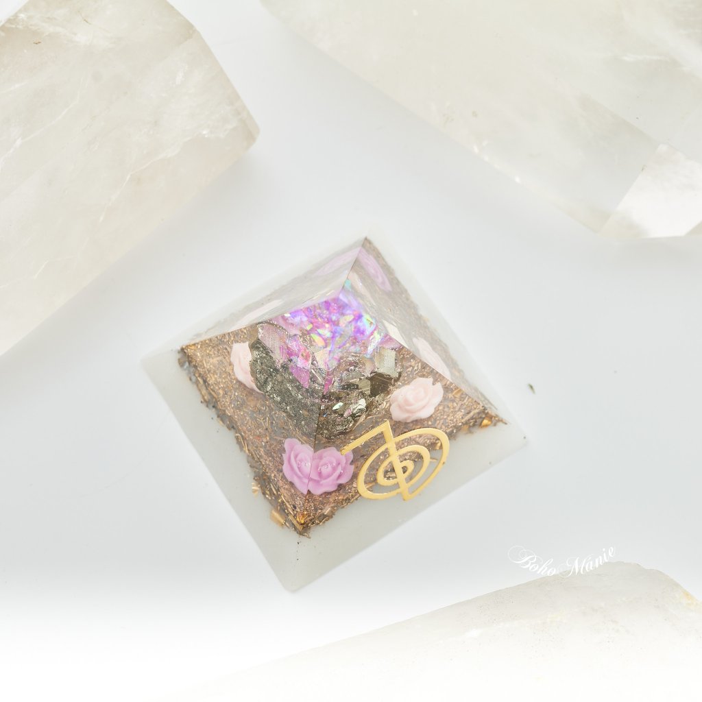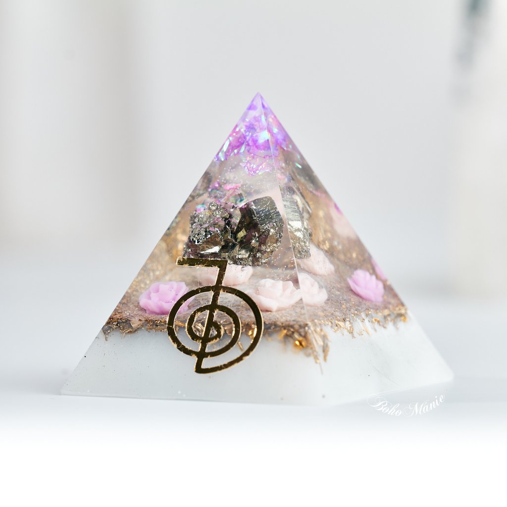 Jemnost a síla se nevylučují – naopak, jedna bez druhé ztrácí smysl. Tahle orgonitová pyramida v sobě nese jejich rovnováhu: klid křišťálu, vřelost růžové energie a jiskru pyritu, která chrání a posiluje.