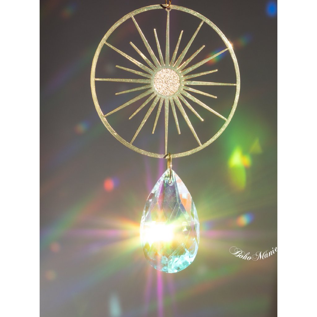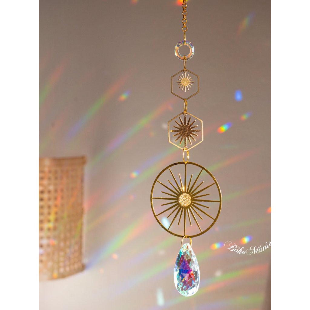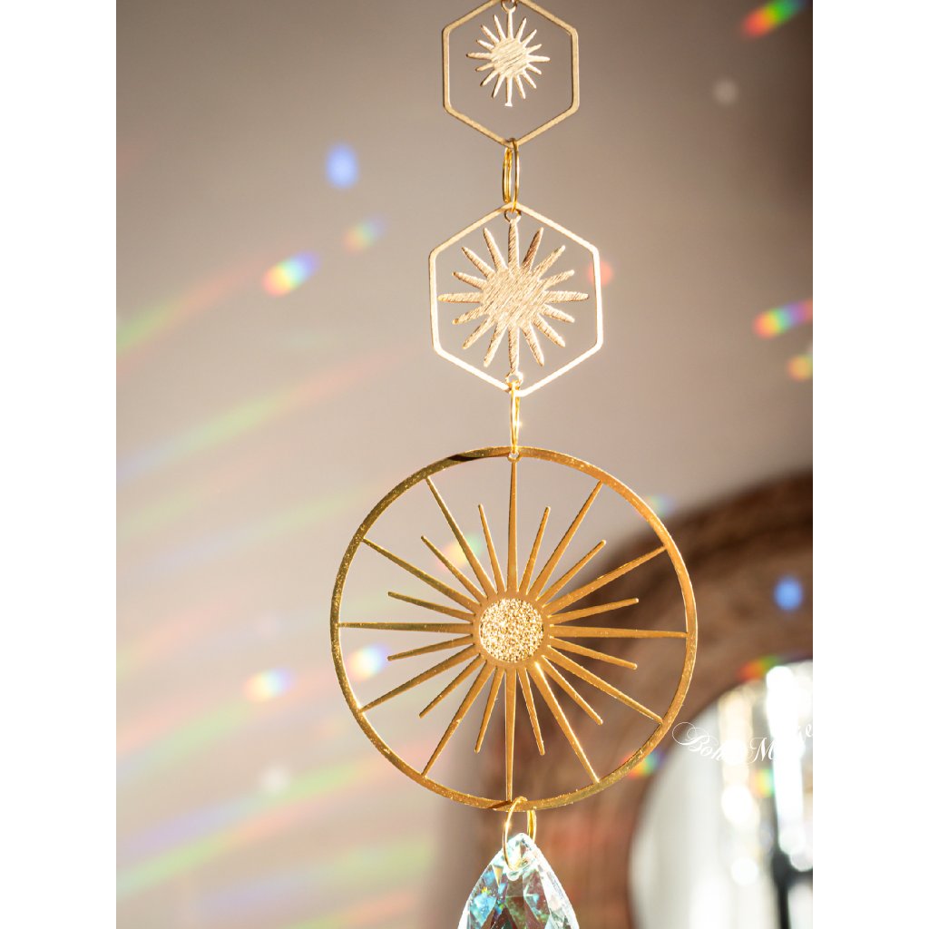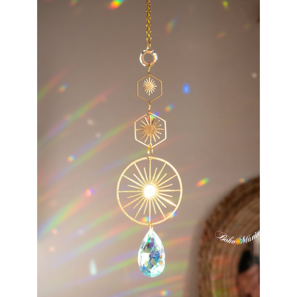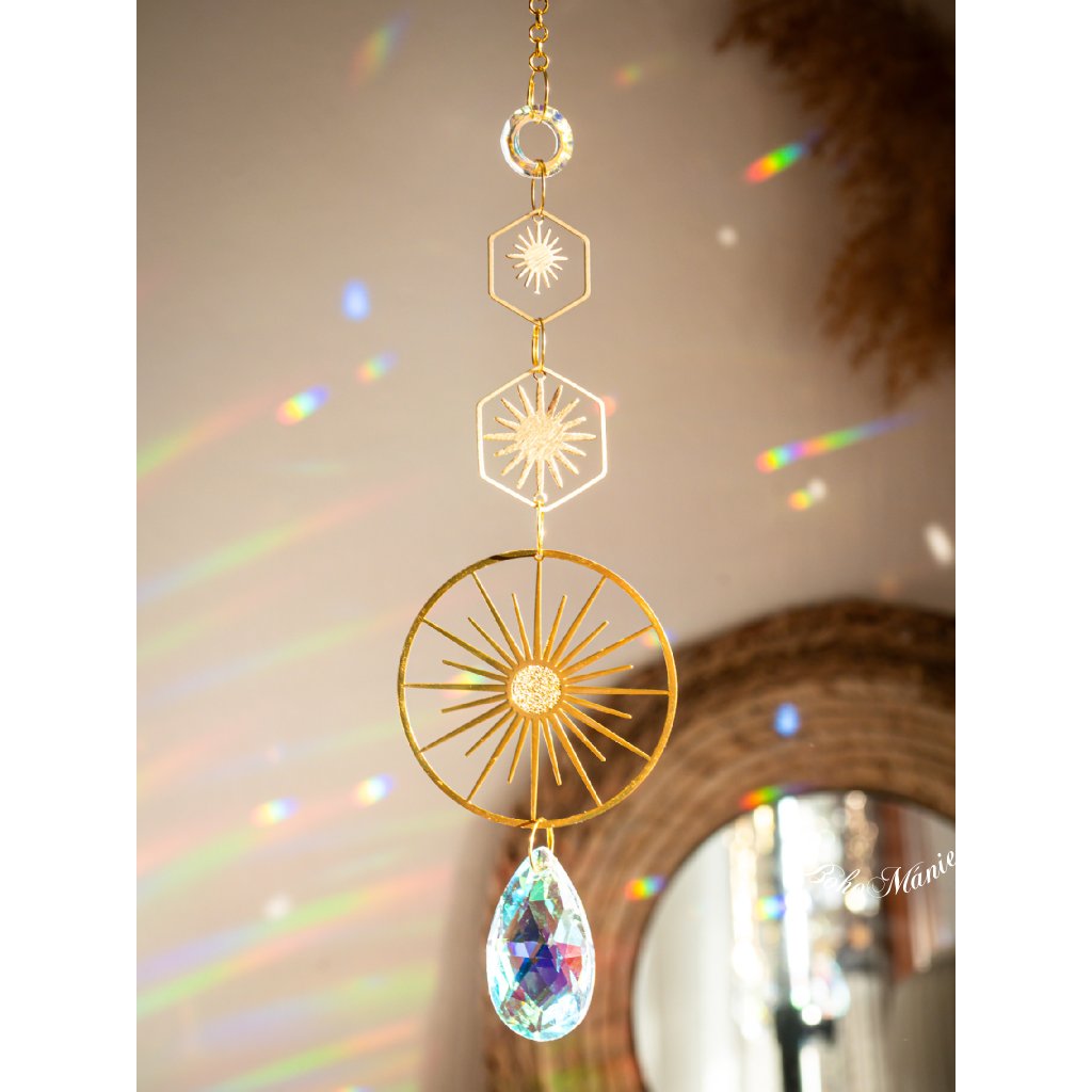 Tento lapač slunce propojuje motiv sluneční geometrie, jemné zlaté symboly a broušenou feng shui kapku, která dokáže rozehrát místnost barvami v okamžiku, kdy ji zachytí světlo.