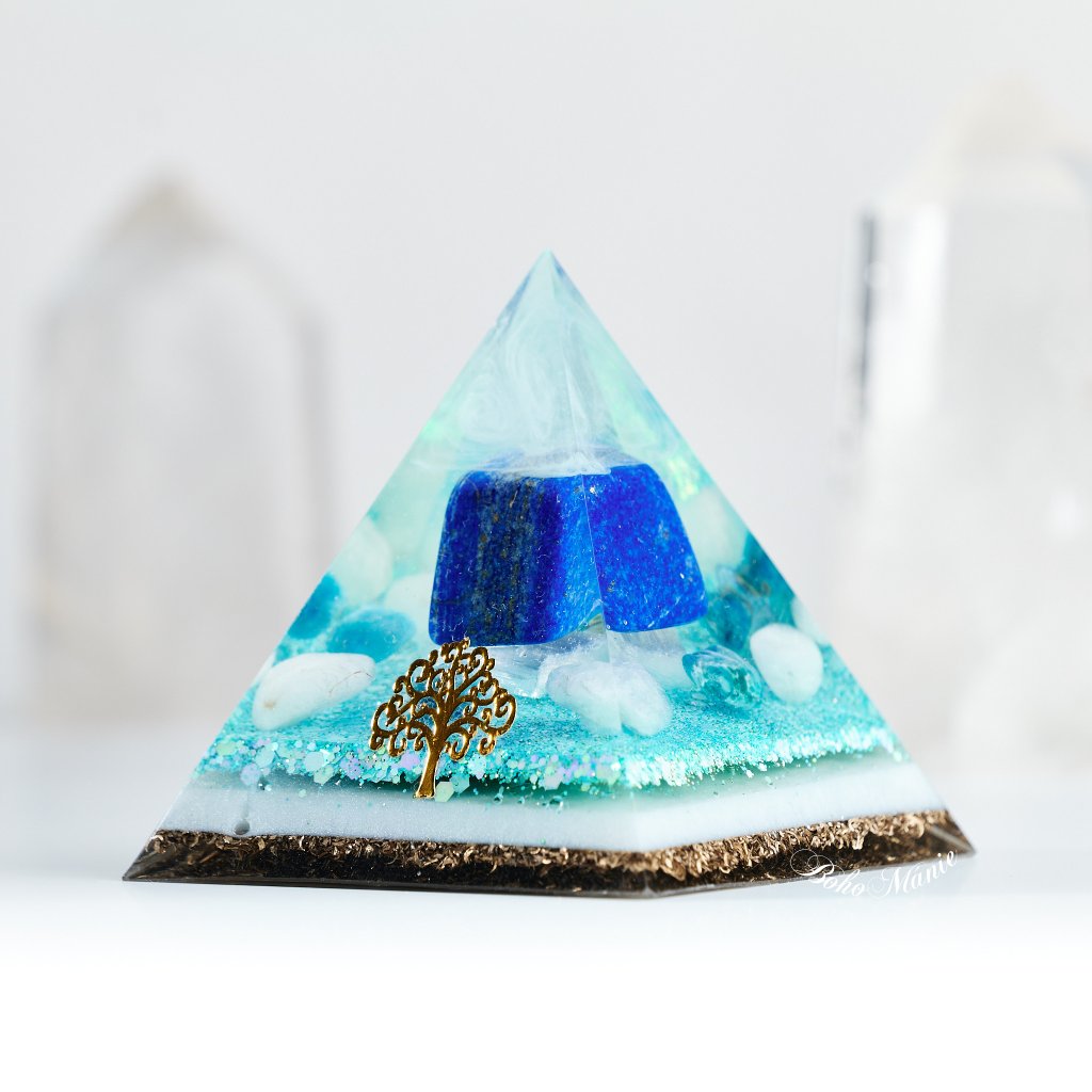 Její energie působí jako hluboký nádech po dlouhé cestě – klidná, jasná, královsky vyrovnaná. Tahle orgonitová pyramida spojuje moudrost, intuici a sílu pravdy. V jejím srdci se setkává hloubka lapisu lazuli, plynutí akvamarínu, čistota křišťálu a světlo selenitu.