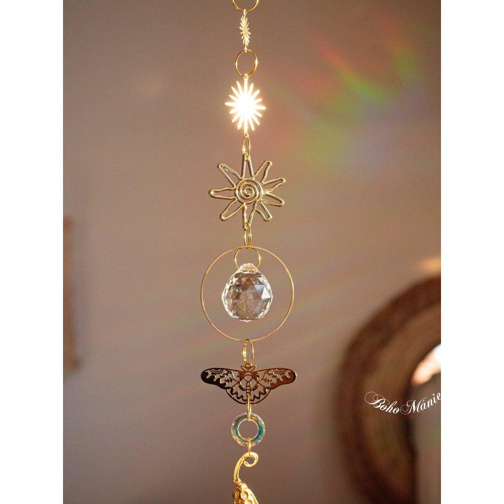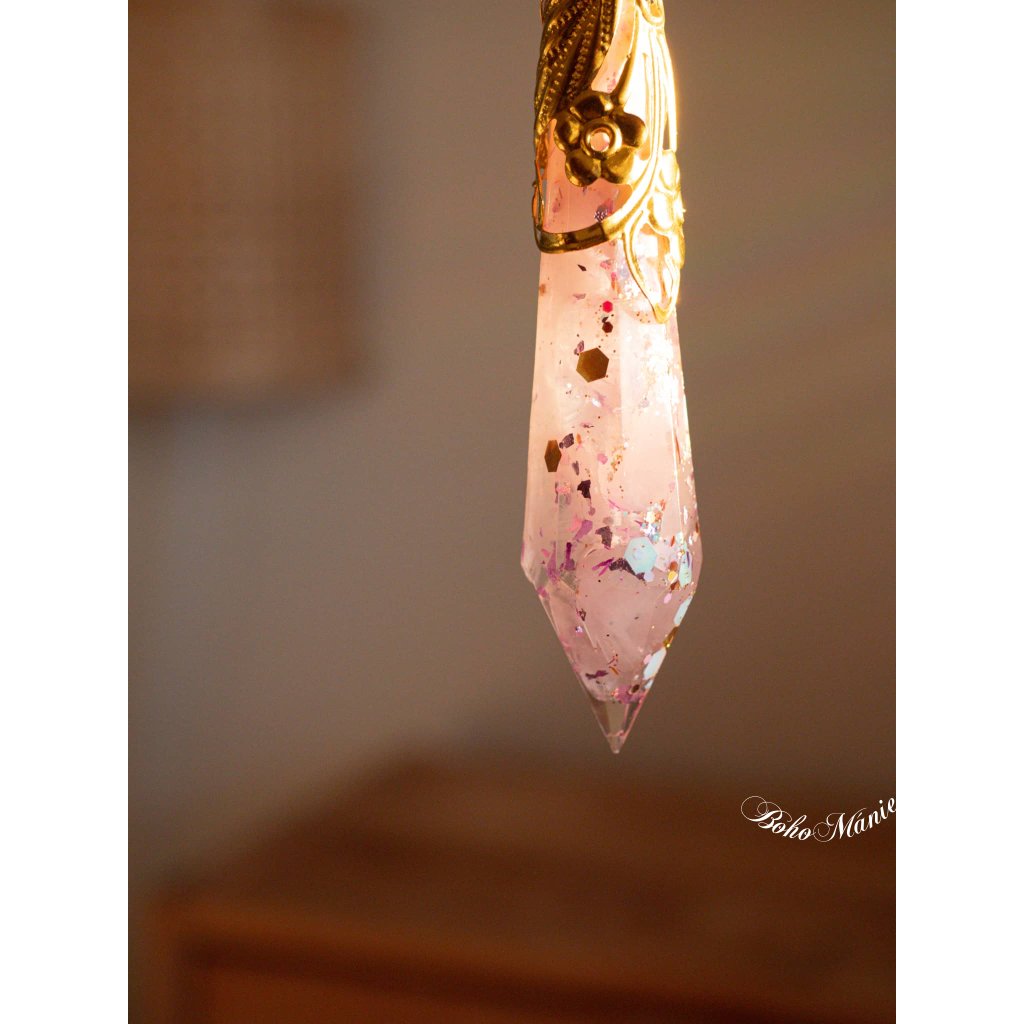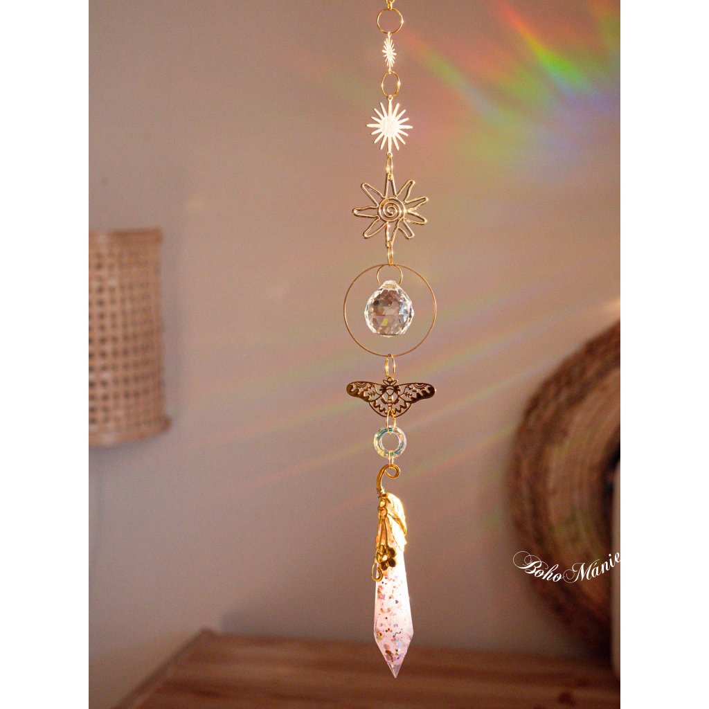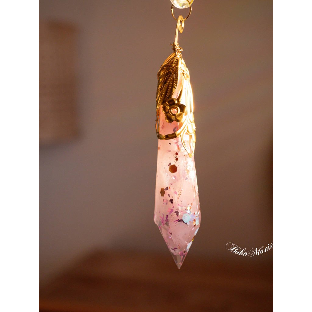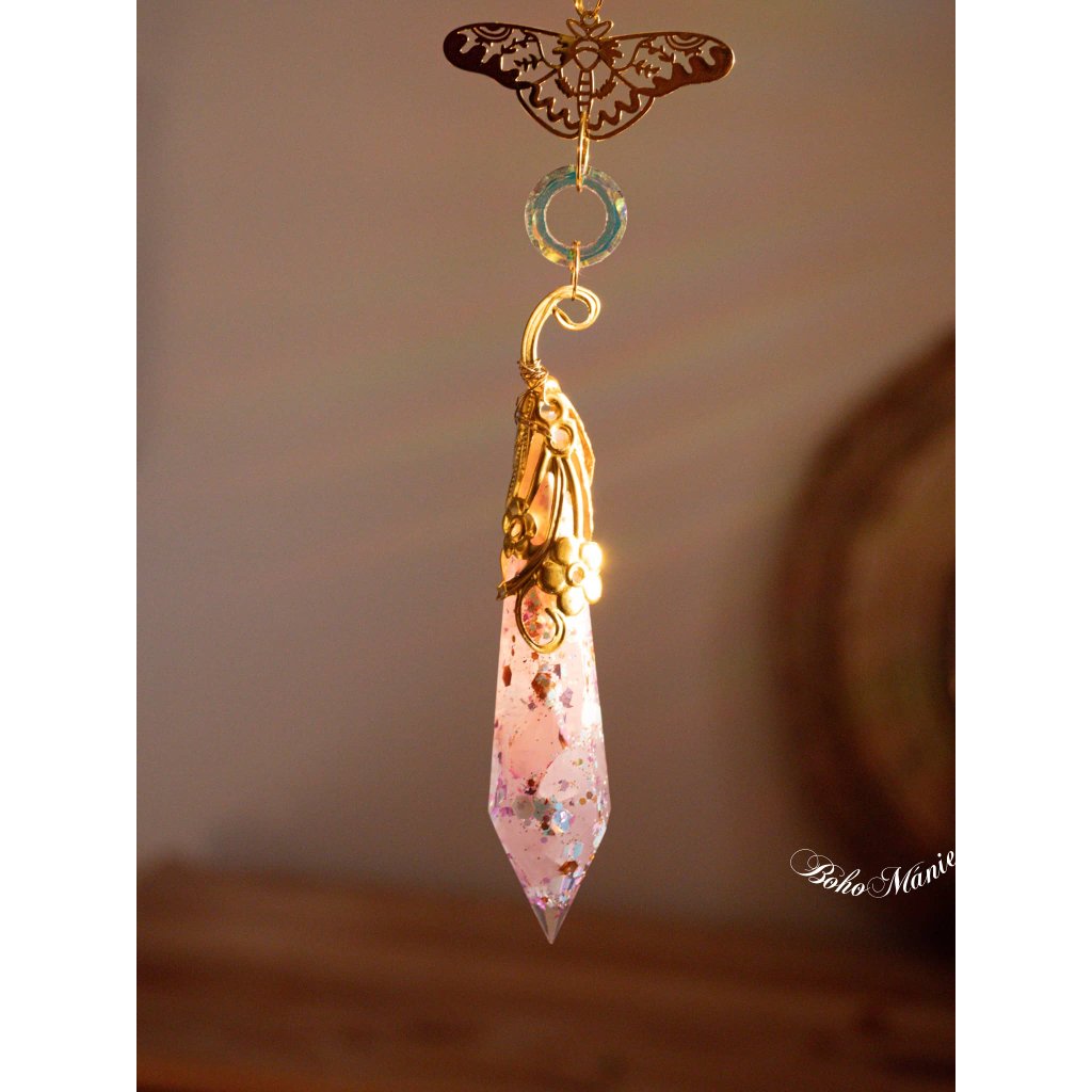 Tento lapač slunce propojuje růženínovou orgonitovou špičku, motýlí symbol transformace a broušené krystaly, které rozzáří prostor měkkými růžovými odlesky. Jemná energie růženínu podporuje klid, laskavost a návrat k sobě.