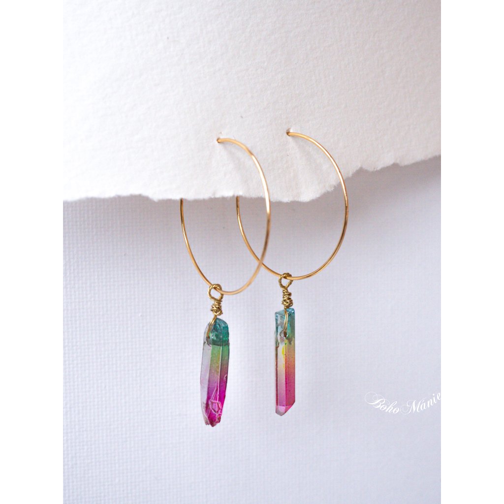Duhový křišťál působí jako kapka světla, která si nese všechny barvy najednou. Má v sobě hravost, jemnou radost a pocit, že den může být o kousek lehčí. V těchto náušnicích vytváří živý, ale nevtíravý efekt – barevný odlesk, který se mění s pohybem a připomíná malý moment svěžesti uprostřed běžného dne.