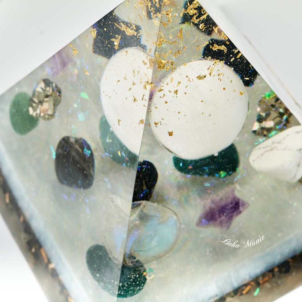 Tahle orgonitová pyramida v sobě nese ticho nočního světla. Selenit, který ji prostupuje, působí jako měsíční paprsek dopadající na hladinu — zklidňuje a očišťuje. V jejích vrstvách se snoubí křišťál, ametyst, mechový achát, pyrit, skoryl, sodalit a howlit – jemná souhra kamenů, které propojují světlo, ochranu i rovnováhu.