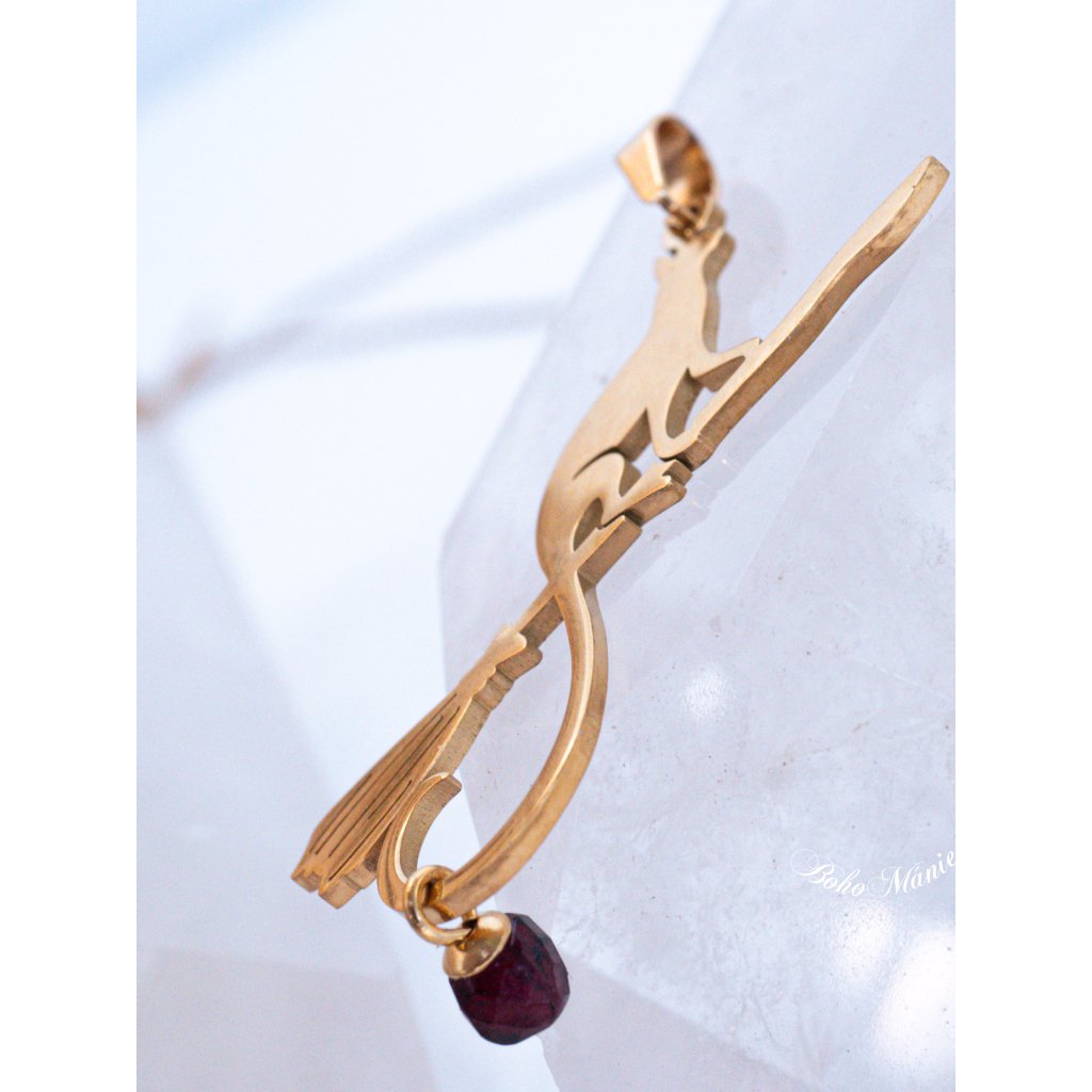 Kočka v sobě nese tichou nezávislost a měkkou bdělost. V kombinaci s granátem se její energie zemitě usazuje — granát je hřejivý, hluboký a podporuje pocit stability a vnitřní síly. V tomhle náhrdelníku působí jako malý žhavý bod, který ti připomíná tvé vlastní teplo, odvahu a pevnost.