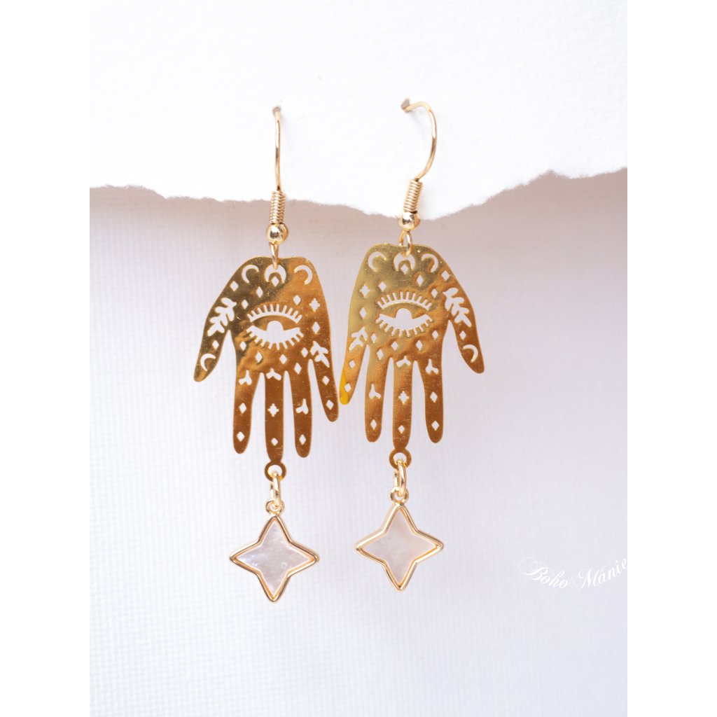 Lehké náušnice s motivem ruky a perletí – jemný, symbolický šperk pro klid, vnímavost a osobní pohodu.