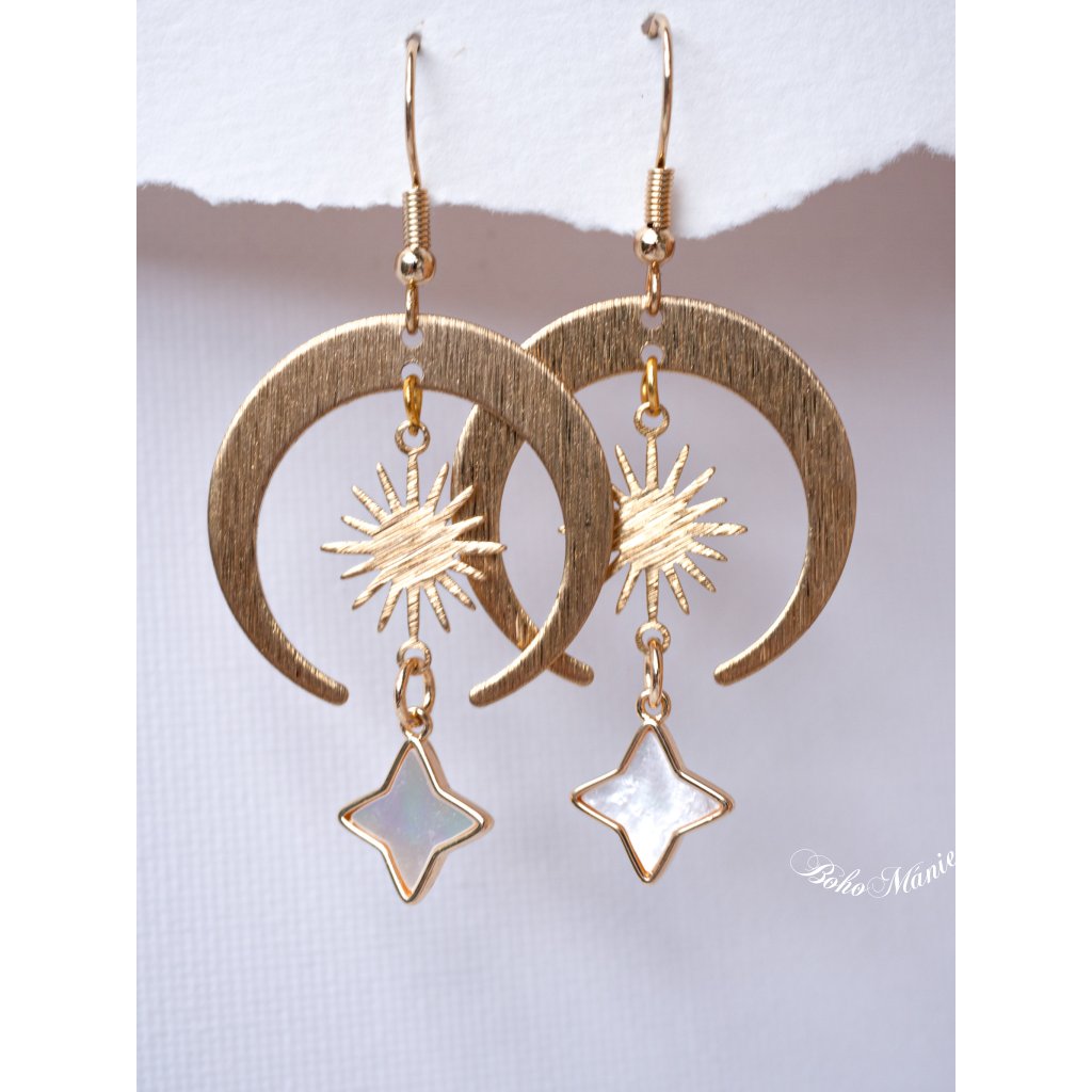 Zářivé náušnice s motivem slunce, měsíce a perleťové hvězdy – lehký šperk pro chvíle, kdy chceš cítit klid a rovnováhu.