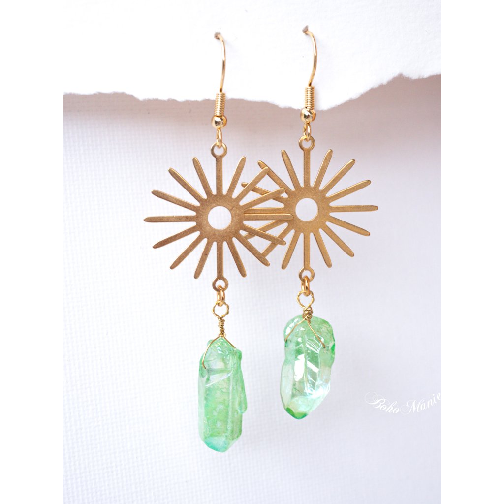 Výrazné náušnice se slunečním motivem a zeleným křišťálem. Svěží, zářivý šperk s lehce povzbuzující energií.