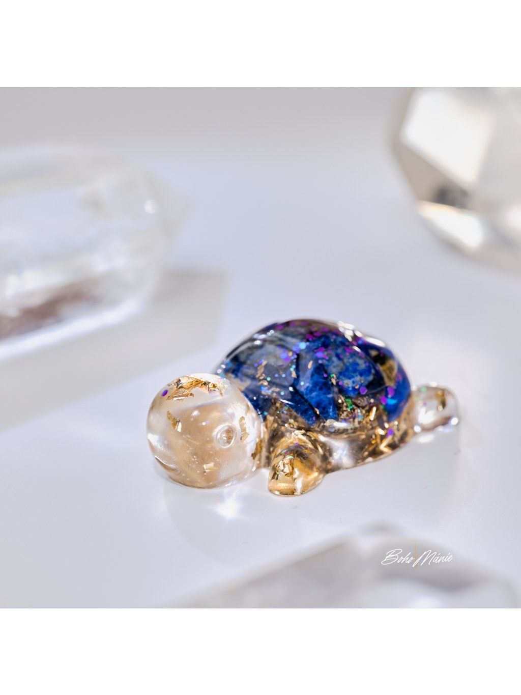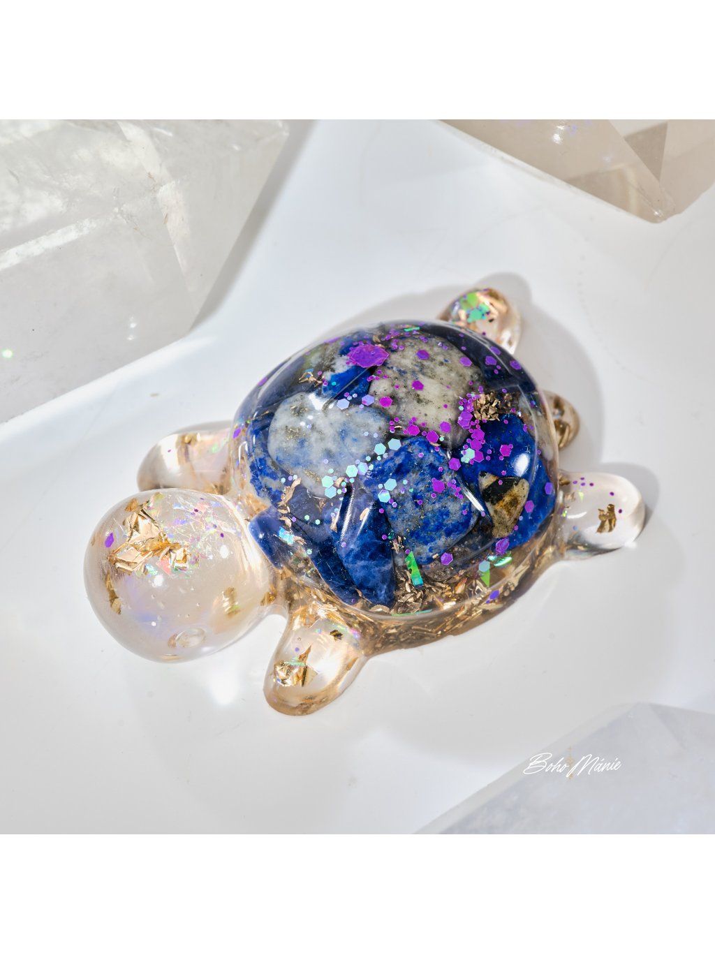 Malý orgonit s lapisem lazuli ve tvaru želvy, ideální do kapsy nebo kabelky. Slouží jako osobní kotva, která pomáhá udržet jasnost, stabilitu a soustředění v běžném dni.