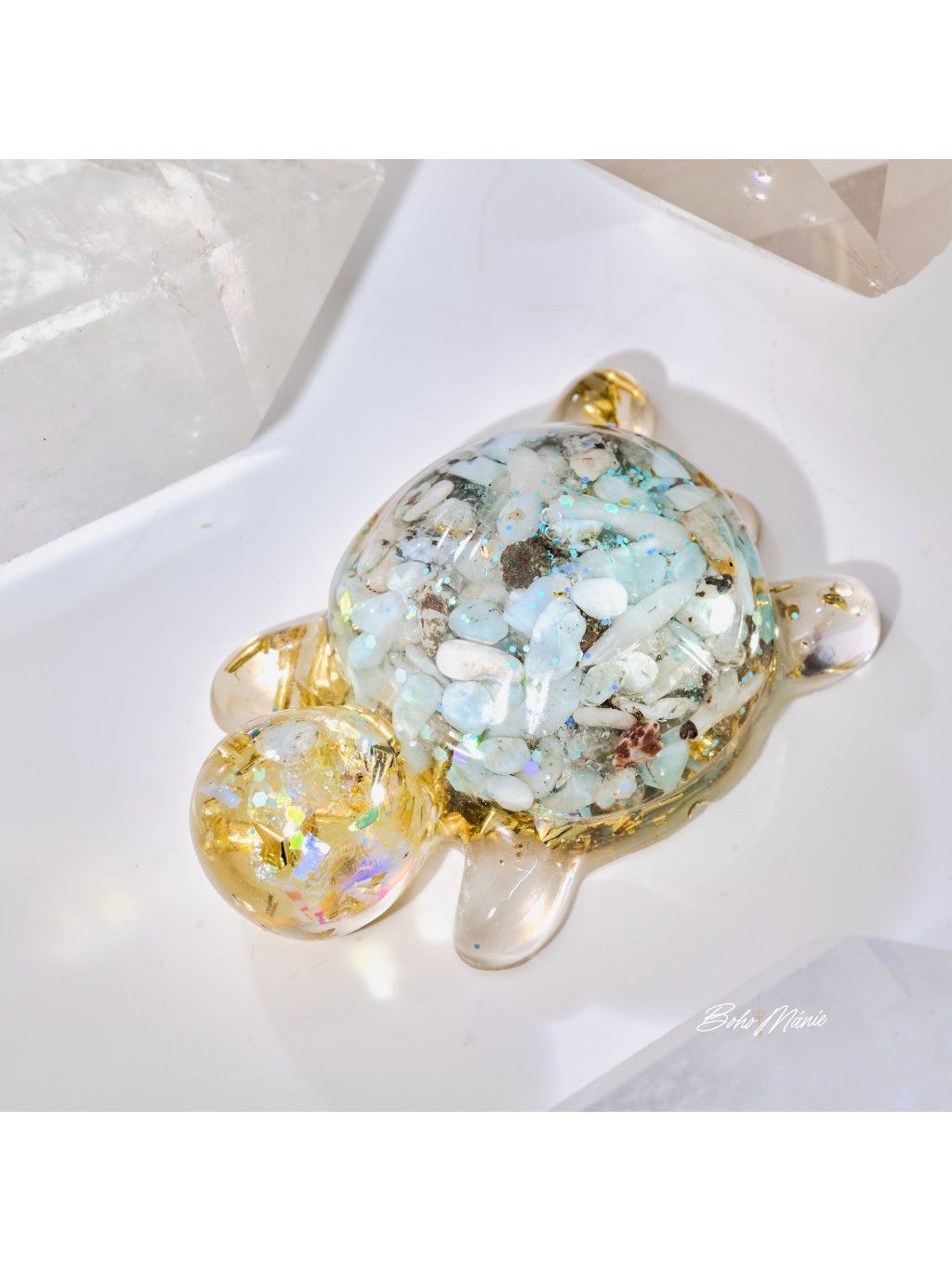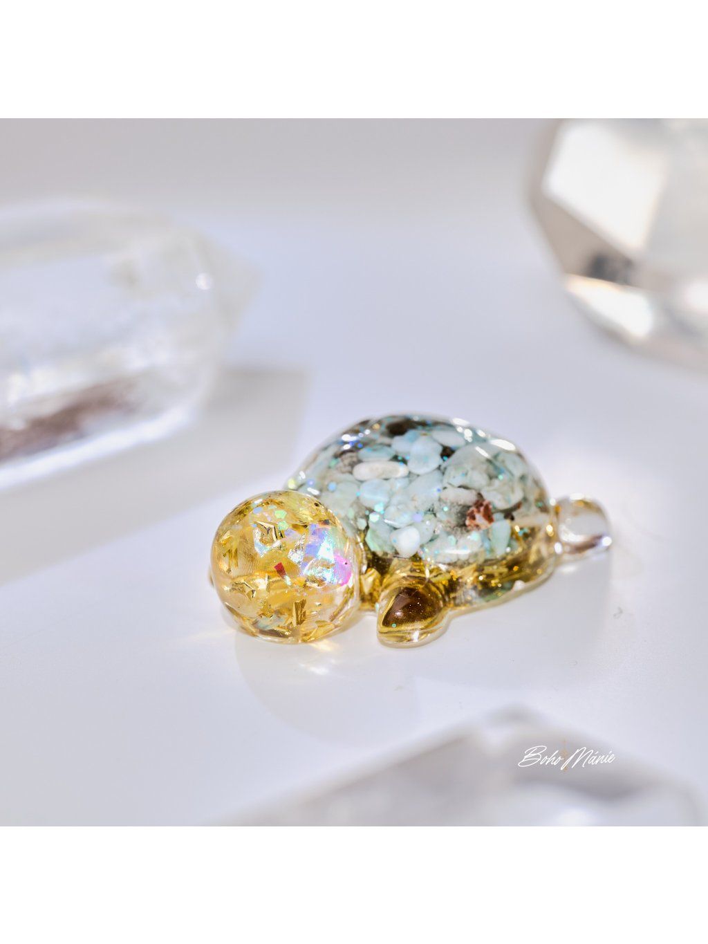 Malý orgonit s larimarem ve tvaru želvy, ideální do kapsy nebo kabelky. Slouží jako osobní kotva, která pomáhá udržet jasnost, stabilitu a soustředění v běžném dni.