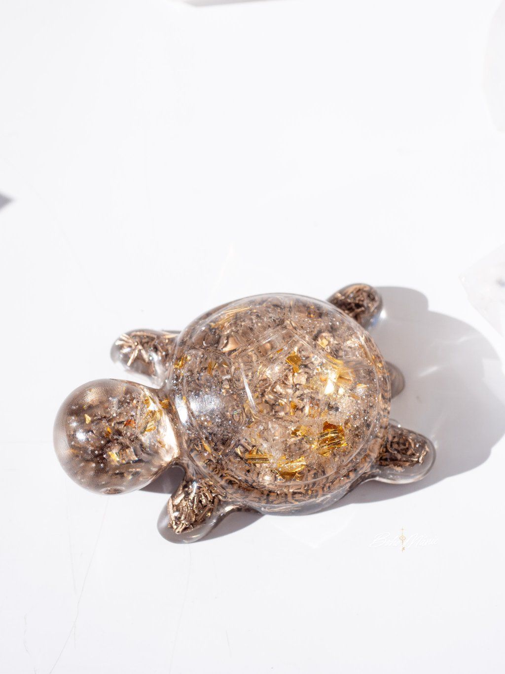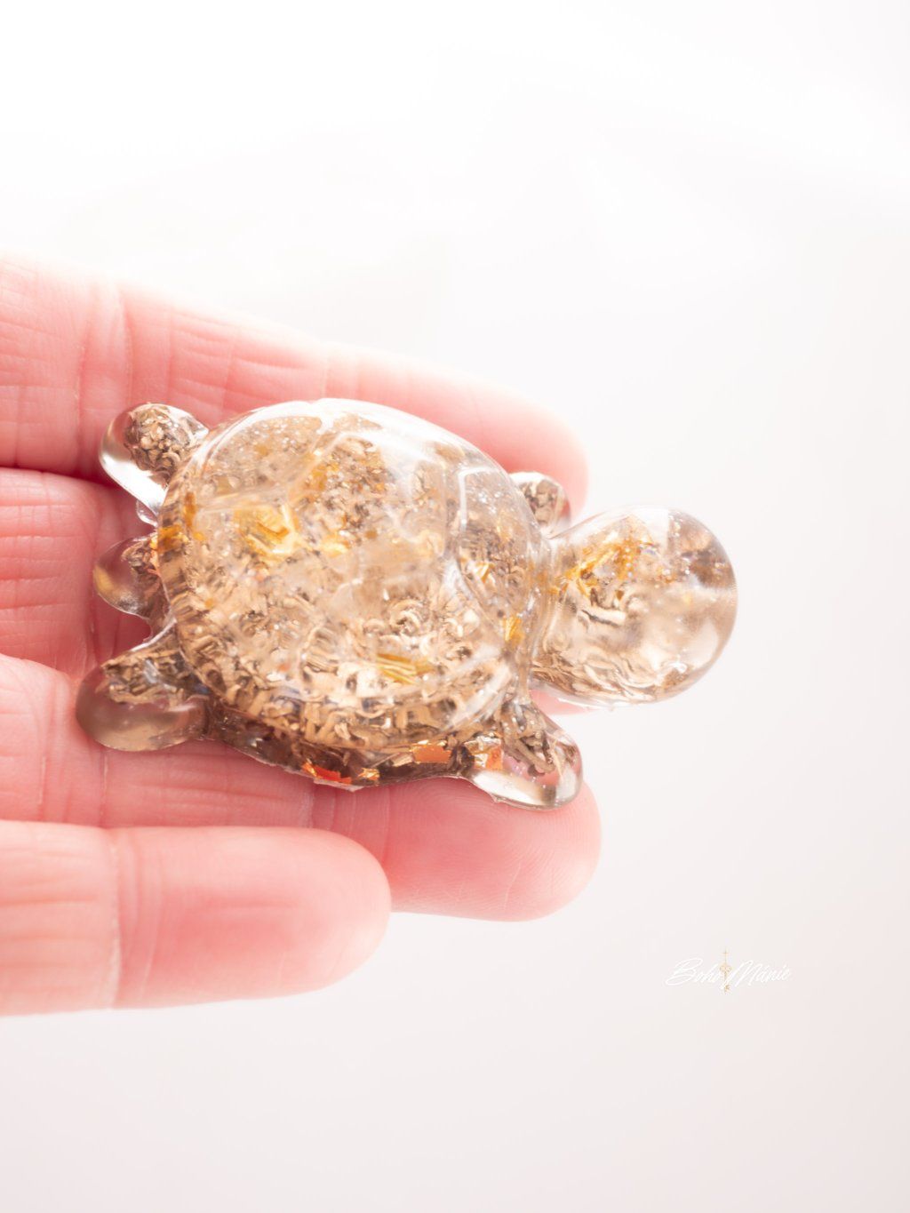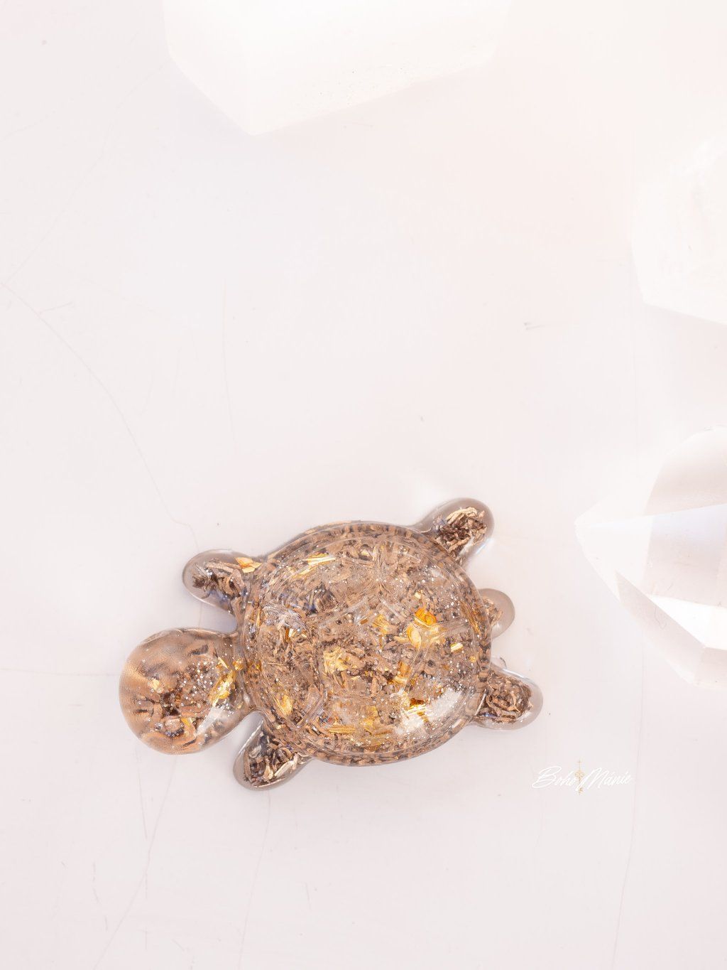 Malý orgonit s křišťálem ve tvaru želvy, ideální do kapsy nebo kabelky. Slouží jako osobní kotva, která pomáhá udržet jasnost, stabilitu a soustředění v běžném dni.
