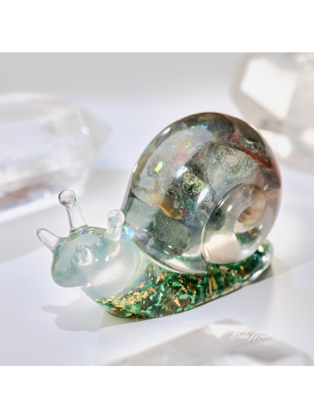 Jaspis ve sněčkovi jako dotek hebkosti a rovnováhy. Jemně zklidní, otevře komunikaci a přítomnost. Připomene ti, že síla je též v klidu.