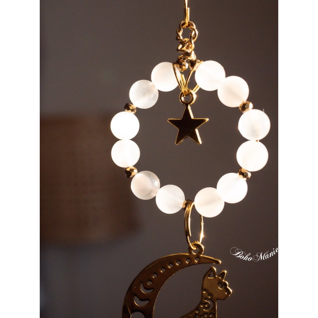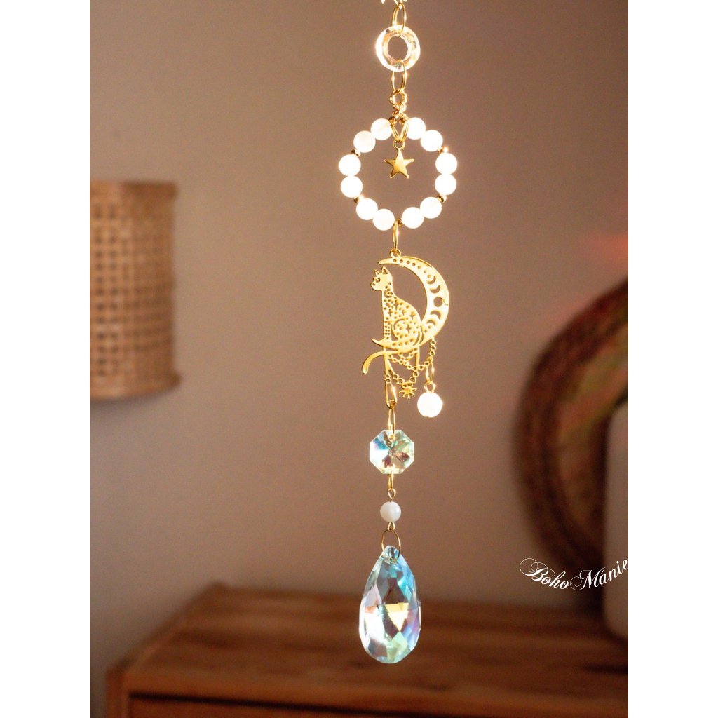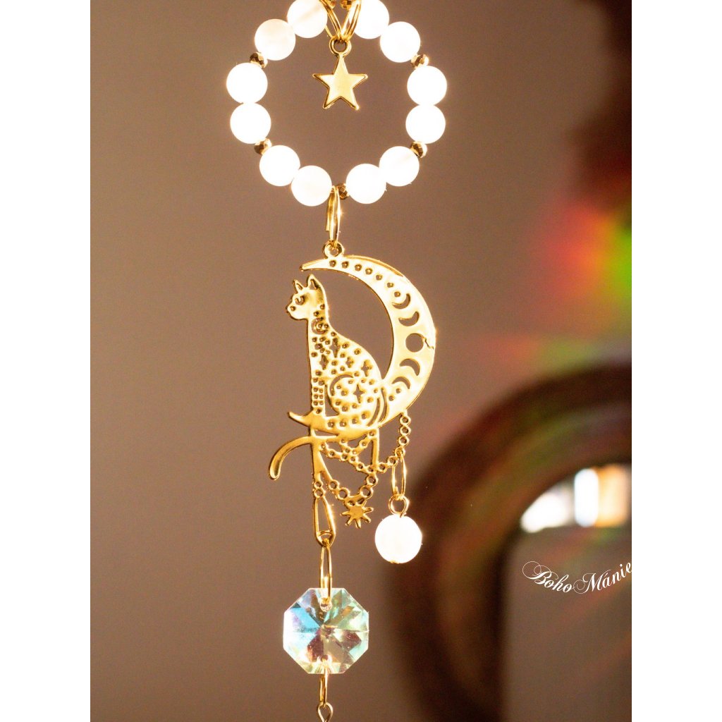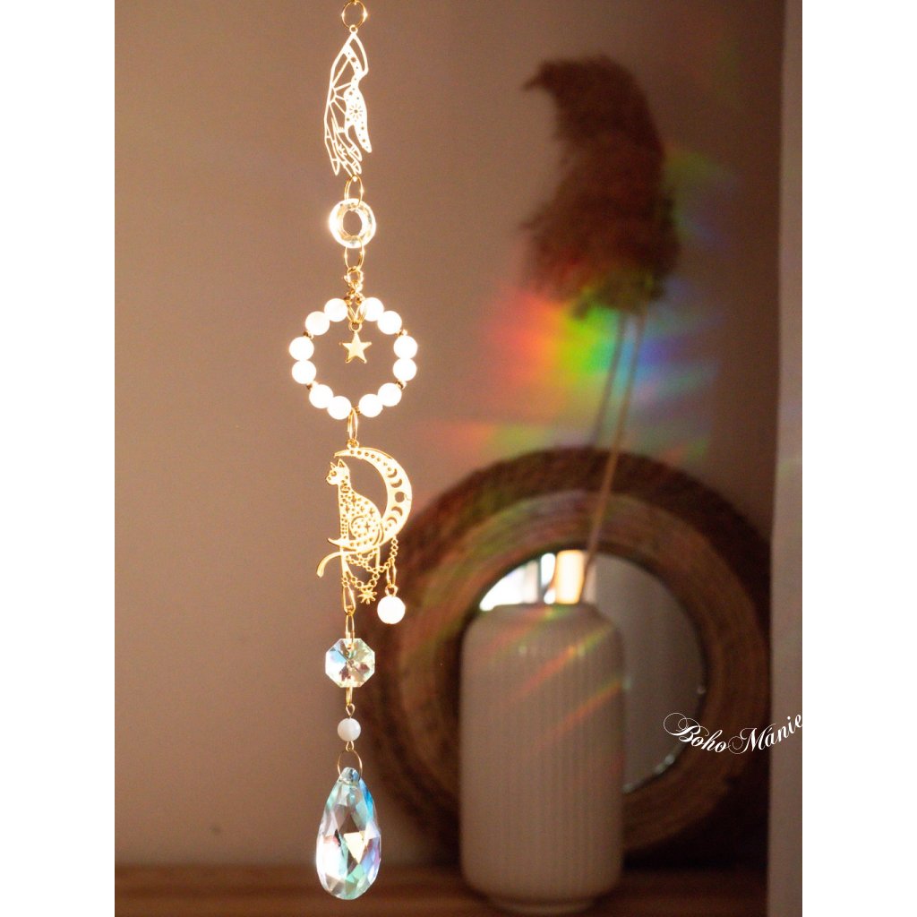 Měsíční kámen a kočičí symbol vytvářejí v tomto lapači energii intuice, klidu a jemné ochrany. Každý paprsek světla se mění v duhový odlesk, který ti pomůže lépe vnímat vlastní emoce a udržet kolem sebe tichý vnitřní prostor.