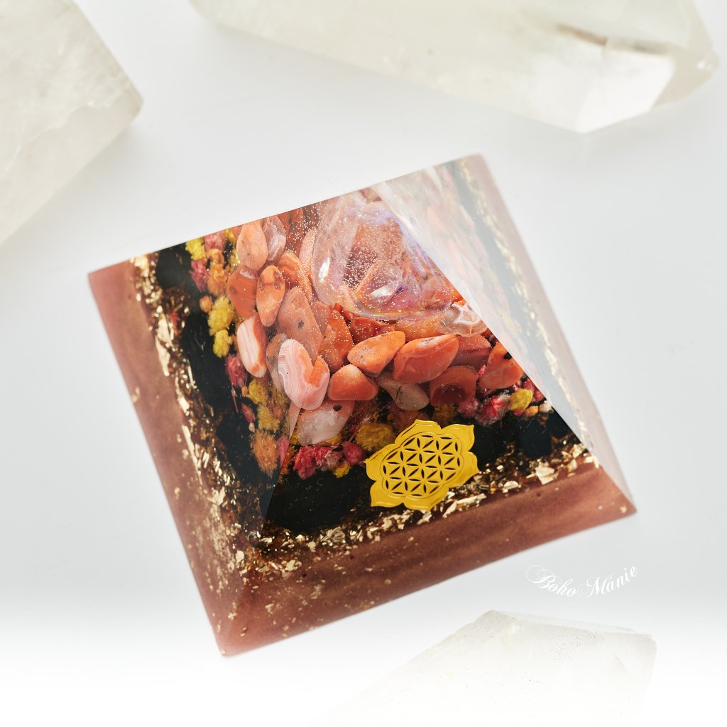 UZEMNI SE - ORGONIT PYRAMIDA * karneol, turmalín, aura křišťál